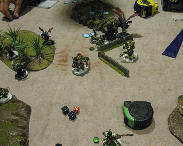 I don't exactly remember how my warjacks were positioned, but Slag Troll did a two-handed throw and released Dire Troll Mauler from melee, who then tried to come help Borka in a desperate battle.