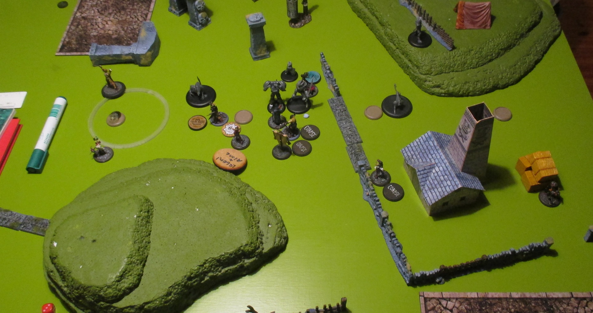 A sorrow in the middle-left marker charged Gravedigger. While Dead Dandy had managed to make a corpse this turn, Poltergeist just removed it and even tossed Dead Dandy to hazardous terrain where he was then standing with two health remaining, and easily within 4" of a Life Leecher.
